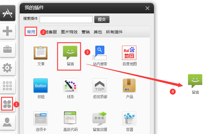 PC和手機版留言插件(適用版本基礎版、標準版、營銷版)通過本部分的操作,您可順利為您的網(wǎng)站設置留言插件。1、在側邊欄選中插件-》常用-》把留言插件拖拽到需要的位置后,選擇留言插件的樣式,然后點擊保存。選擇“留言表單”后點擊確定樣式如下2、如需修改成其他樣式,選中留言模塊,在樣式設置中可更換留言模塊的樣式??蛇x樣式效果如下默認樣式選項如下圖可以設置按鈕提交后跳轉頁面鼠標點選效果設置項3、系統(tǒng)默認只有兩項留言項目:標題以及內容,如果希望訪客給您留言時填寫更多或更少信息,可通過“設置”添加或者刪除字段。例如