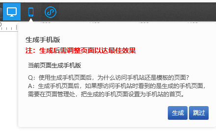 ?可用版本:基礎版,標準版,營銷版的PC+手機套餐(單PC或手機不適用)支持轉換的插件有:文章分類/文章列表/百度地圖/容器/按鈕/在線客服/線條/圖片/導航/文本/會員登錄(頁腳中的模塊不會被轉換)①.Pc版新建頁面,編輯好頁面之后,雙擊手機按鈕,彈出提示,點擊生成,即可將當前頁面生成手機版,如選擇跳過,將不生成頁面直接進入手機站②.生成手機版,Pc的插件將生成相應的手機插件,如果是手機中沒有的樣式,將生成該手機插件的第一個默認樣式。手機中的布局將根據(jù)自主研發(fā)的算法來生成含"底版"的PC頁面在生成手