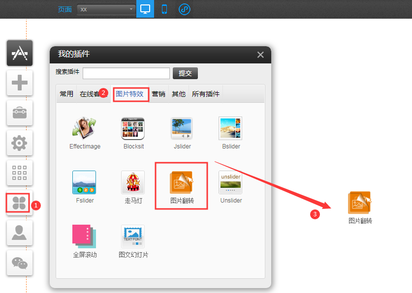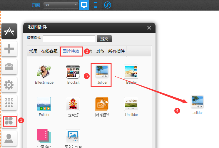 PC版Jslider插件(適用版本基礎版、標準版、營銷版)Jslider是一種用幻燈片顯示的方式展示多張圖片,適用用于制作bannner1.依次點擊插件-圖片特效-選中Jsilder插件,把插件拖拽到您需要的位置2.點擊設置-》選擇需要的樣式增加圖片根據(jù)需要配置全局設置-保存。2-1Jslider有多種展示效果供您選擇。點擊展開選擇您需要的效果2-2Jslider在圖片管理中可以更換圖片并設置超鏈接、標題、描述。設置完后記得在右上角點擊保存。顯示效果如下。