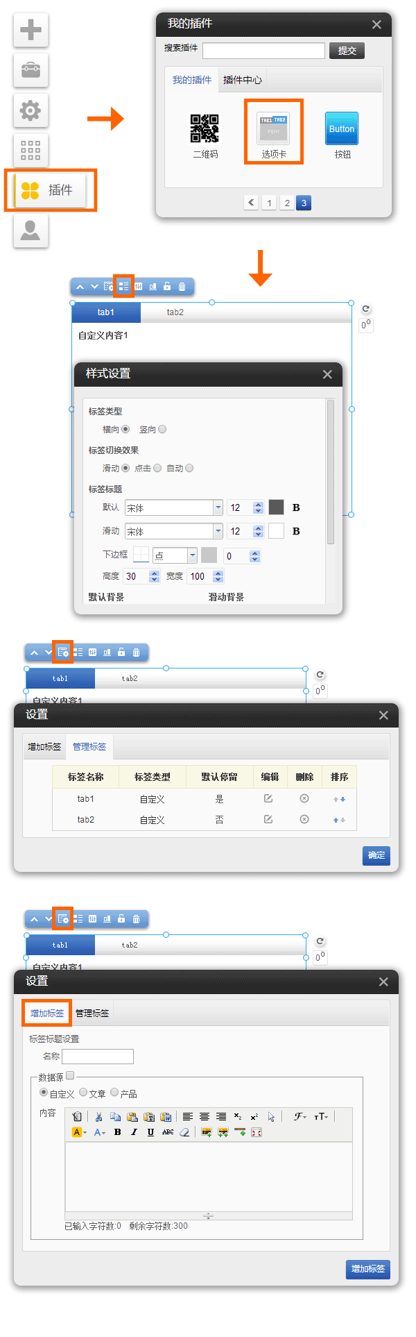 選項卡插件 使用方法:進入網(wǎng)站編輯-〉點左側插件圖標-〉插件中心,找到選項卡圖標,點啟用 A可選擇數(shù)據(jù)源,支持3種類型 a自定義支持在線編輯器,可以錄入文本或插入圖片 b文章調用系統(tǒng)文章數(shù)據(jù),支持圖文和文本樣式設定 c產品調用系統(tǒng)產品數(shù)據(jù),可以支持按照分類和標簽組合條件查詢,支持圖文和文本樣式設定 B標簽類型支持橫向和豎向,切換效果支持3中效果:滑動、點擊和自動(豎向暫不支持自動切換) C支持標簽標題和標簽背景相關樣式設定 D每個選項卡插件可支持添加8個標簽,支持調整標簽順序,設置默認停留