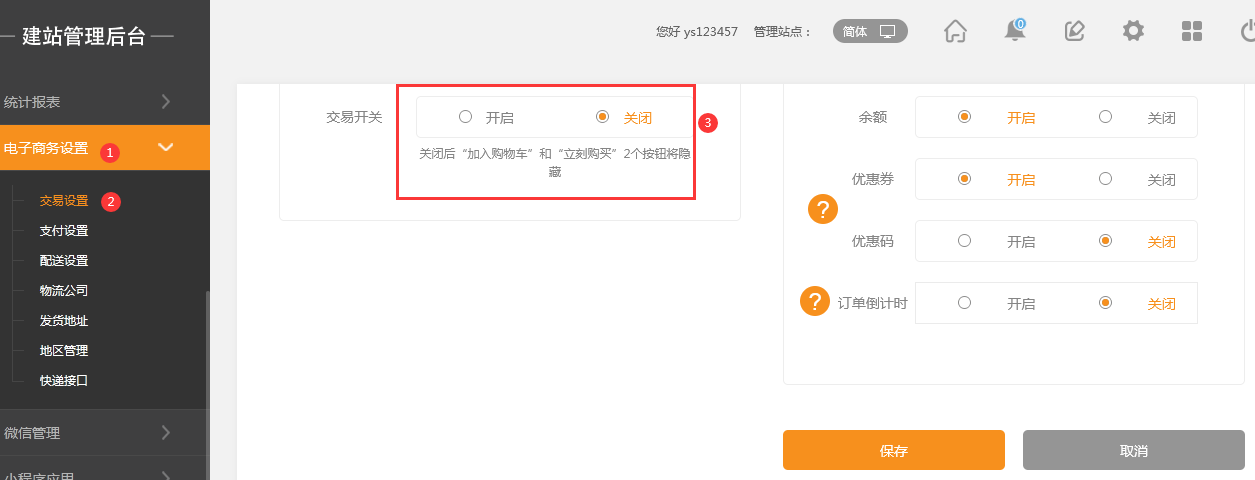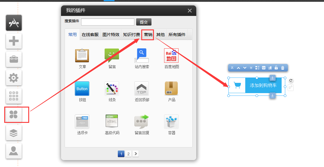 標準版(營銷版)產(chǎn)品詳情中“購物車”為什么不顯示?在“管理后臺”的“電子商務(wù)設(shè)置>交易設(shè)置”中,檢查交易開關(guān)是否開啟,如果交易開關(guān)關(guān)閉則不顯示購物車。如果開啟后還不顯示請在網(wǎng)站后臺點擊“網(wǎng)站編輯”“頁面”-》找到帶產(chǎn)品詳情插件的頁面一般名稱為產(chǎn)品詳情。然后選中產(chǎn)品詳情插件點擊樣式設(shè)置向下拉動找到“加入購物車”和“立即可購買”設(shè)置,勾選后保存即可