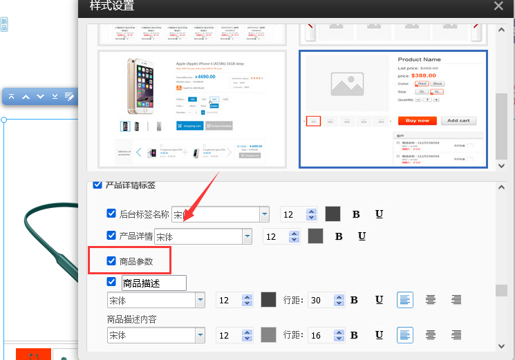 在產(chǎn)品詳情插件中點擊樣式設(shè)置勾選顯示商品參數(shù)顯示位置如圖所示添加參數(shù)位置在后臺-》產(chǎn)品屬性中添加后,在添加產(chǎn)品時設(shè)置對應(yīng)屬性即可