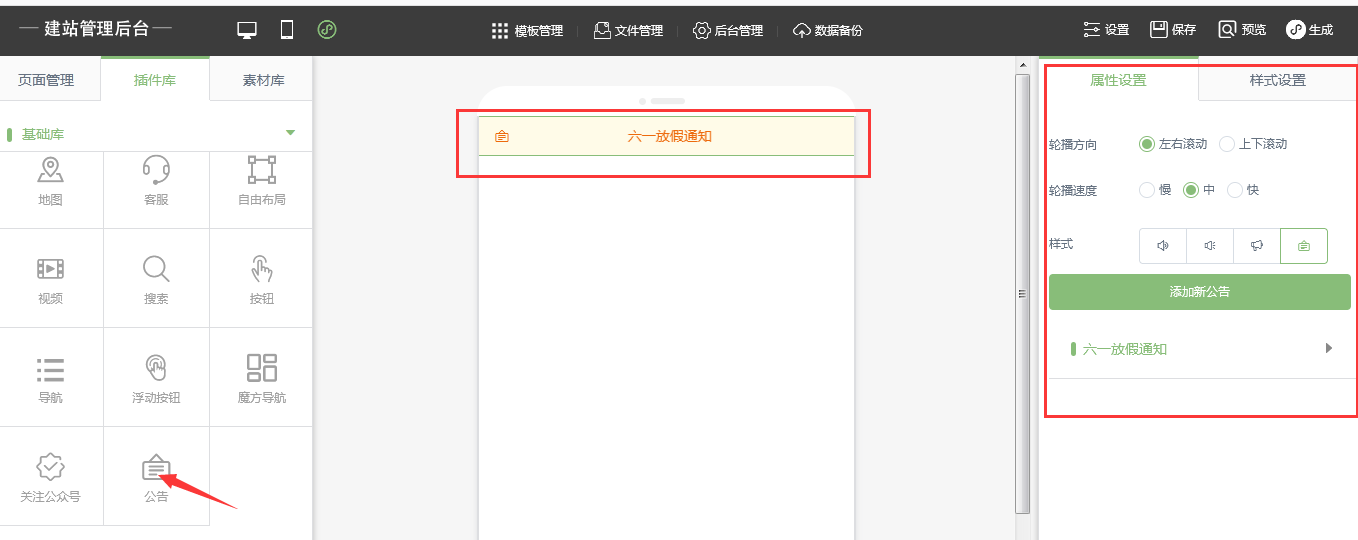 公告插件(小程序全版本)1.在小程序編輯器,現(xiàn)新增公告插件,使用該功能發(fā)布重要消息可使用戶更易發(fā)現(xiàn),用戶也可點擊公告內(nèi)容文字跳轉(zhuǎn)到設(shè)置的對應(yīng)頁面,如下圖所示:
