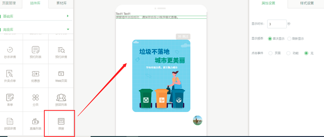 1.在小程序編輯器-插件庫-高級庫,現(xiàn)在新增彈窗插件,該功能可以讓用戶進入頁面時,插件以彈窗的形式展示重要信息,樣式如下圖: