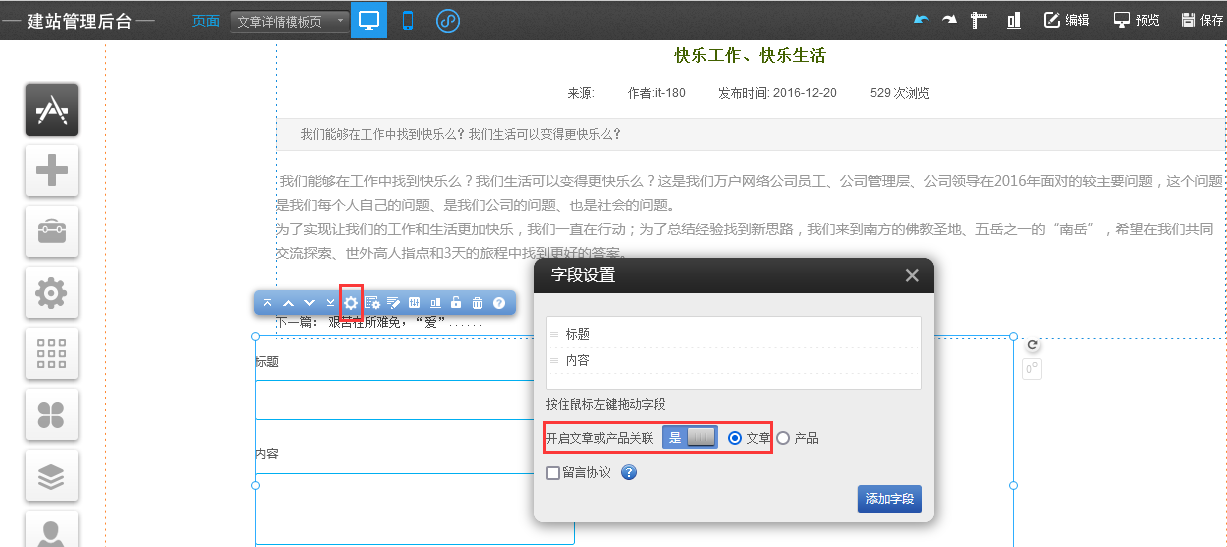 使用場景:管理員可以從后臺看到用戶在哪一個產(chǎn)品或者文章下進(jìn)行的留言,從而精準(zhǔn)的獲得用戶的需求。注意:該功能需要和產(chǎn)品/文章詳情插件搭配使用!1.1電腦端前臺:“插件”—“留言”插件中增加與產(chǎn)品/文章關(guān)聯(lián)設(shè)置項;步驟如下:“字段設(shè)置”—“開啟文章/產(chǎn)品關(guān)聯(lián):是”—“文章/產(chǎn)品”,注意:查看留言數(shù)據(jù)需要到后臺的“營銷工具”模塊中“留言管理”,選擇對應(yīng)的留言頁面即可查看客戶留言后可以看到客戶具體在那一個產(chǎn)品或文章中留言效果如下圖1.2手機(jī)端前臺:“插件”—“留言”插件中增加與產(chǎn)品/文章關(guān)聯(lián)設(shè)置項;步驟如下:“字段