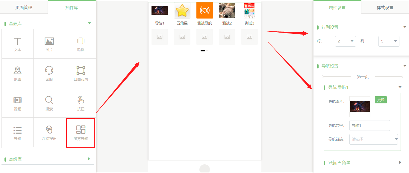 魔方導(dǎo)航插件(小程序全版本)1.在小程序編輯器中,新增了“魔方導(dǎo)航”插件,最多支持2頁,共20個導(dǎo)航菜單,每個導(dǎo)航菜單可單獨(dú)設(shè)置,如圖所示: