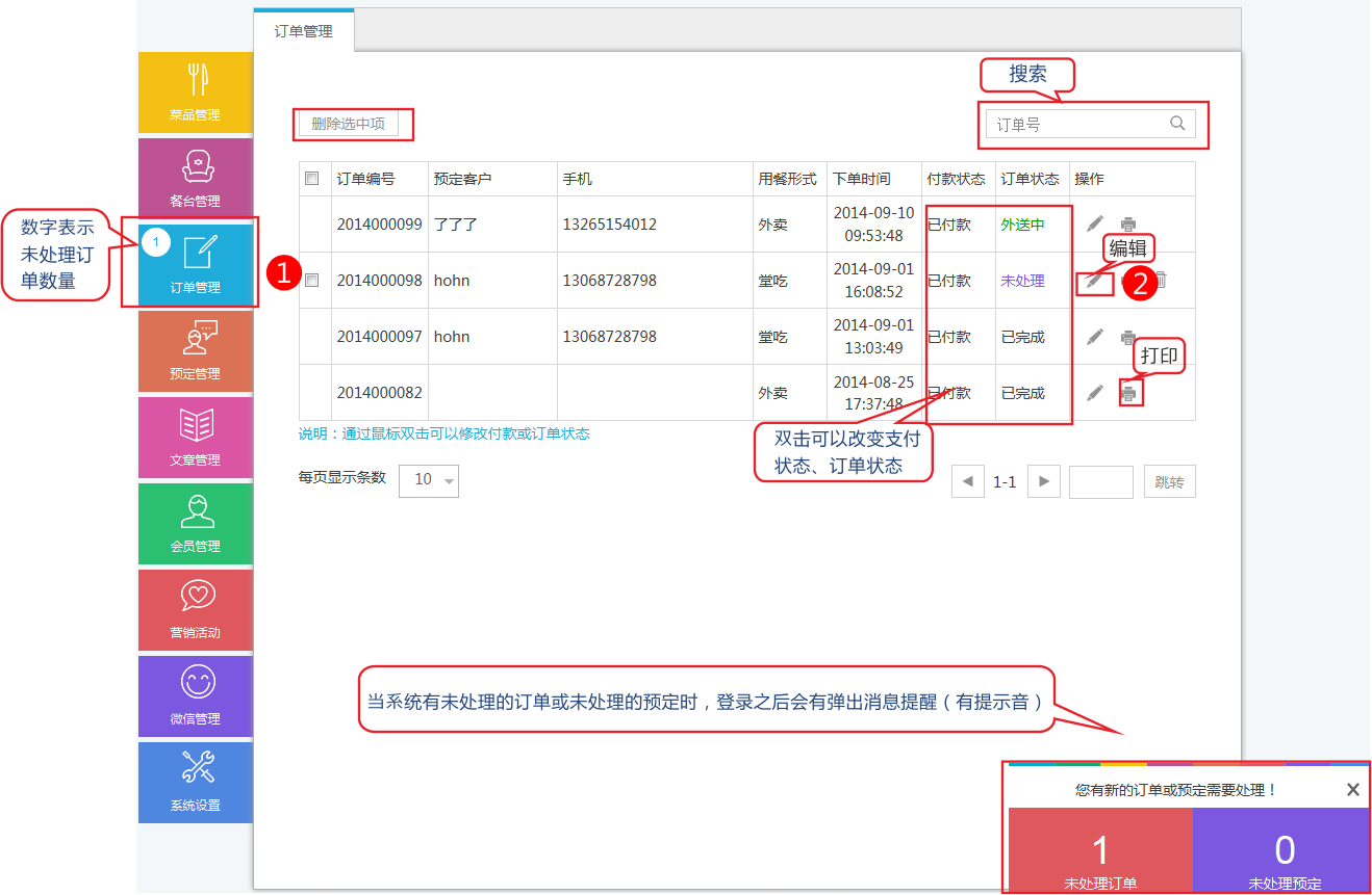 訂單是顧客在商店訂餐后的表現(xiàn)。訂單生成后,店主通過處理訂單來完成款項的轉(zhuǎn)移與菜品的配送。訂單的處理是微餐飲中非常重要的一個環(huán)節(jié)。 如果顧客注冊會員后購買,則登陸會員中心也可看到訂單信息 訂單處理流程說明 一般情況下,處理訂單的流程為:支付-->上菜-->完成。取消在特殊情況下使用。 支付:如果顧客在訂單生成后選擇在線付款,則訂單中支付會變?yōu)榛疑?,無法點(diǎn)擊;如果顧客是選擇的到店支付,則店主在收到款項后點(diǎn)擊支付。 完成:當(dāng)訂單支付完成、并且上菜完成,則店主可以選擇把此訂單設(shè)置為完成狀態(tài)。