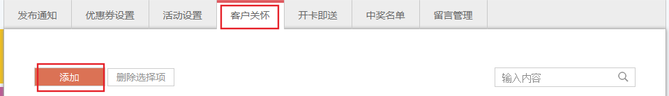 主要分為兩種關(guān)懷:節(jié)日關(guān)懷生日關(guān)懷 1.依次點(diǎn)擊營銷活動-》客戶關(guān)懷-》添加 2.設(shè)置節(jié)日名稱、類型、活動人群、節(jié)日時間、贈送的內(nèi)容、在會員界面展示時間。 注:贈送券需優(yōu)先在優(yōu)惠券內(nèi)編輯才可勾選贈送; 節(jié)日關(guān)懷:【券的開始時間】必須在【贈送時間】之后才可勾選贈送; 生日關(guān)懷:建議贈送券的時間設(shè)置較長,避免券到期后,系統(tǒng)將不再贈送; 如需讓用戶知道該節(jié)日贈送活動,則可勾選【在會員卡界面展示】。