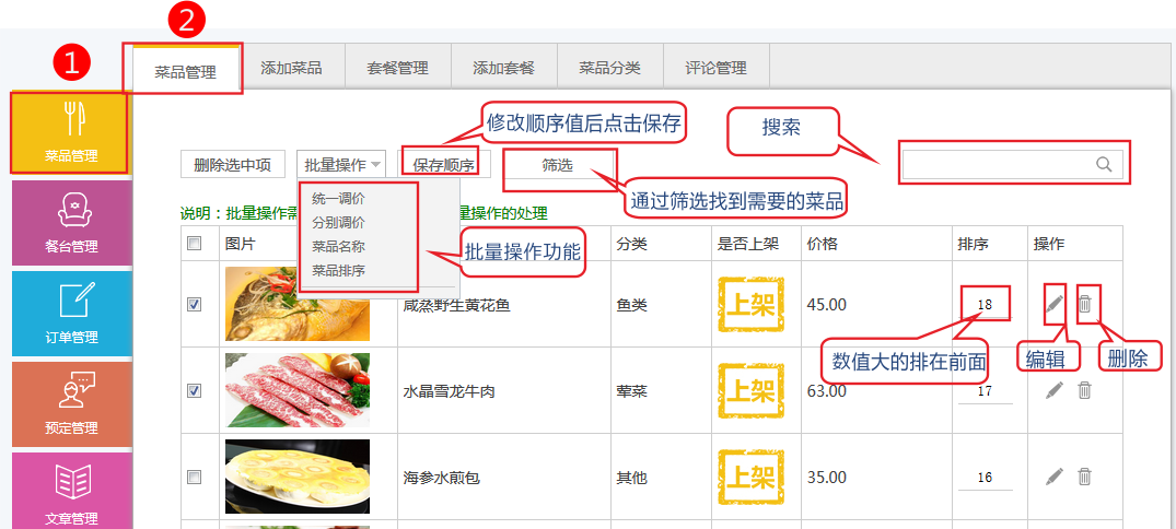 在“菜品管理”中可以實現(xiàn)設(shè)置顯示順序、編輯菜品,批量操作(統(tǒng)一調(diào)價、分別調(diào)價、菜品名稱、菜品順序)刪除等操作。