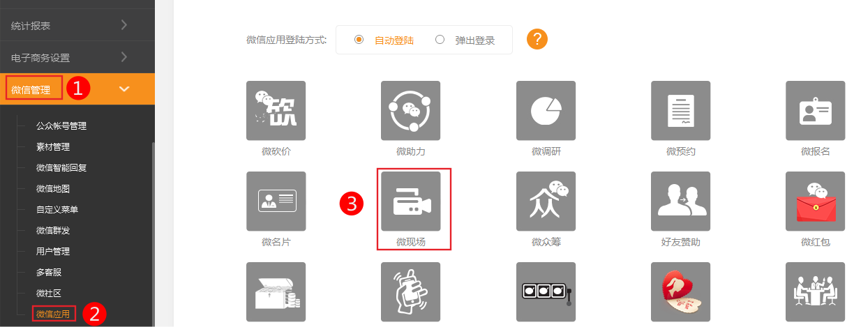 手機(jī)版插件微現(xiàn)場(適用版本手機(jī)營銷版)注意:因為需要獲取參與用戶信息需要認(rèn)證的服務(wù)號,才能正常使用。參與活動需要注冊為網(wǎng)站會員,注意在大屏幕時必須使用chrome瀏覽器。此插件主要方便做現(xiàn)場活動,互動抽獎。前臺:插件中心,添加微現(xiàn)場插件。可以選擇使用哪個微現(xiàn)場數(shù)據(jù)可設(shè)置按鈕樣式后臺:可以添加多個現(xiàn)場活動,查看大屏幕,參與粉絲,設(shè)置抽獎活動獎品。1.依次點(diǎn)擊微信管理-》微信應(yīng)用-》微現(xiàn)場可以添加現(xiàn)場活動,查看大屏幕,參與粉絲,設(shè)置抽獎活動獎品。添加活動、設(shè)置獎品、切到大屏幕添加活動微信公眾號一鍵關(guān)注頁面制作