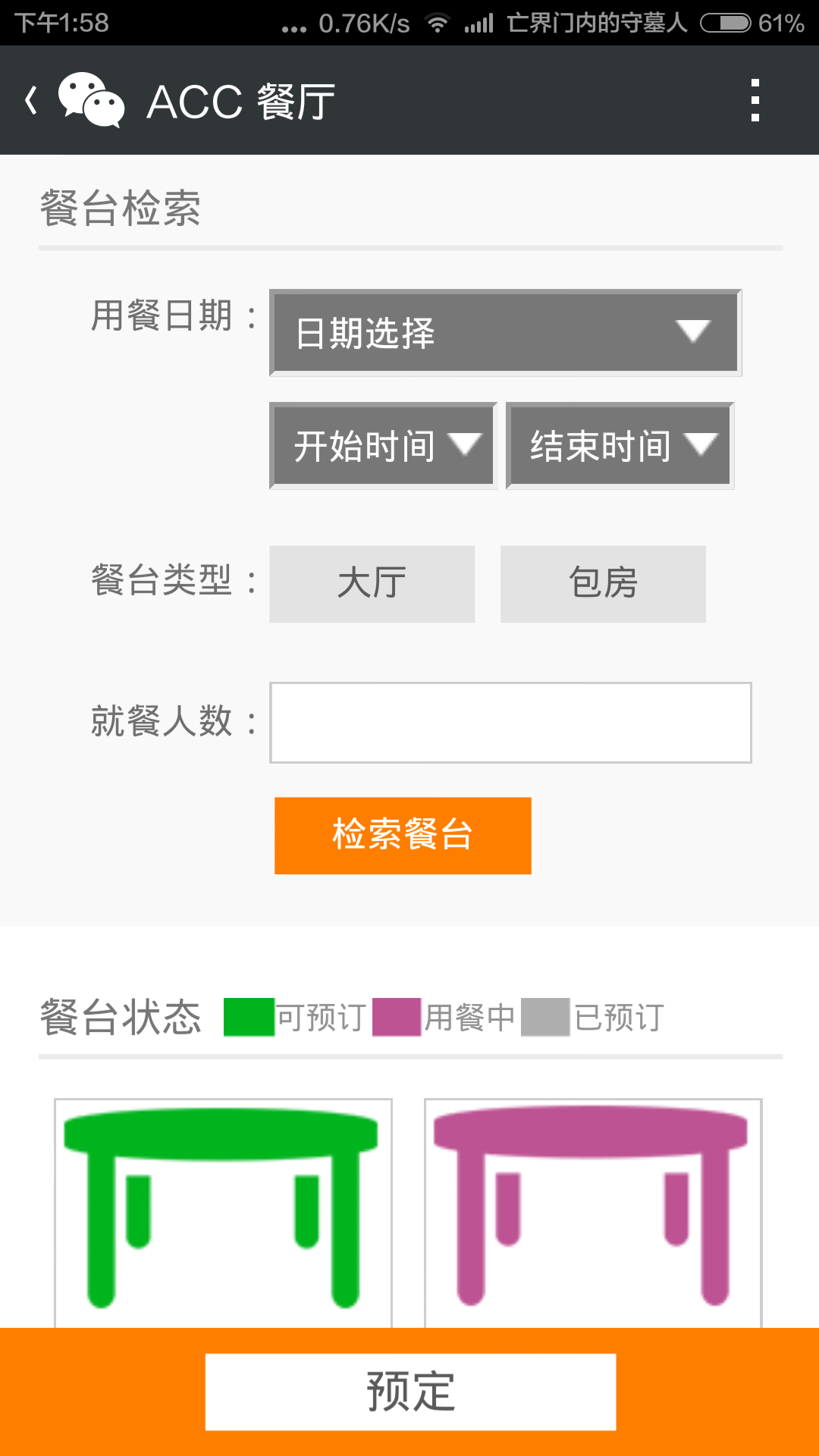 餐臺在前臺的展示效果如下圖 二、添加和管理餐臺 1.在餐臺管理可以添加、編輯、刪除餐臺并且可以改變餐臺狀態(tài)。 注意:可以通過鼠標雙擊餐臺圖片修改狀態(tài),綠色代表“可預定”,紫色代表“就餐中”,灰色代表“已預定” 2.設置餐臺名稱、編號、類型、狀態(tài)、餐臺型態(tài)、適用人數(shù),點擊保存這樣前臺的預定餐臺功能就能實現(xiàn)啦