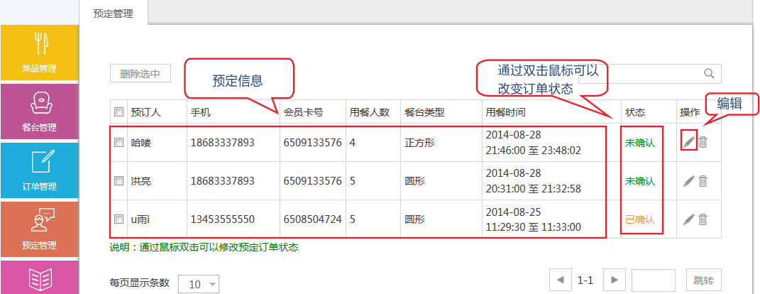 在預定管理中可以確認用戶的訂單狀態(tài)。 1.點擊預定管理,進入預定管理頁面,會出現(xiàn)客戶預訂的信息; 通過鼠標雙擊可以修改預定訂單狀態(tài) 2、編輯預定信息