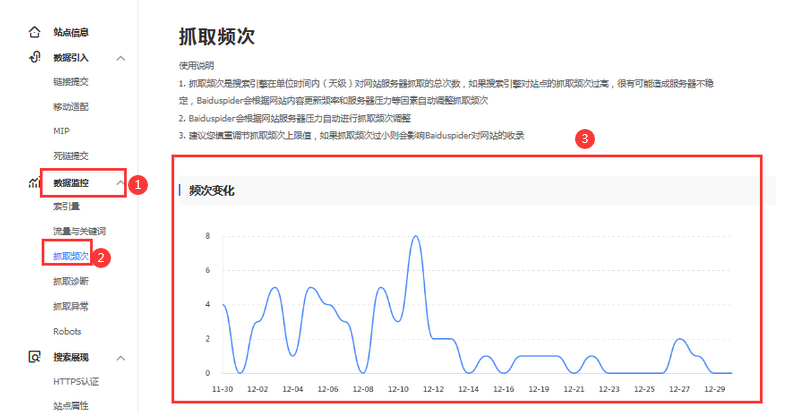 登陸https://ziyuan.baidu.com/平臺后在數(shù)據(jù)監(jiān)控-》抓取頻次-》中查看