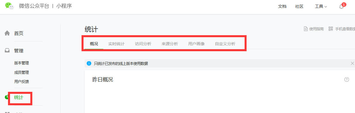 小程序數(shù)據(jù)分析,是面向小程序開發(fā)者、運營者的數(shù)據(jù)分析工具,提供關鍵指標統(tǒng)計、實時訪問監(jiān)控、自定義分析等,幫助小程序產品迭代優(yōu)化和運營。主要功能包括每日例行統(tǒng)計的標準分析,以及滿足用戶個性化需求的自定義分析。登陸小程序后臺-》點擊統(tǒng)計可以查看。具體請參考https://developers.weixin.qq.com/miniprogram/analysis/百度小程序也支持查看統(tǒng)計數(shù)據(jù)